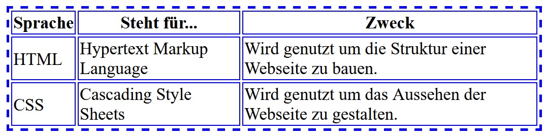 1 2 3 4 5 6 7 8 9 10 11 12 13 14 15 16 17 | <table> <tr> <th>Sprache</th> <th>Steht für...</th> <th>Zweck</th> </tr> <tr> <td>HTML</td> <td>Hypertext Markup Language</td> <td>Wird genutzt um die Struktur einer Webseite zu bauen.</td> </tr> <tr> <td>CSS</td> <td>Cascading Style Sheets</td> <td>Wird genutzt um das Aussehen der Webseite zu gestalten.</td> </tr> |