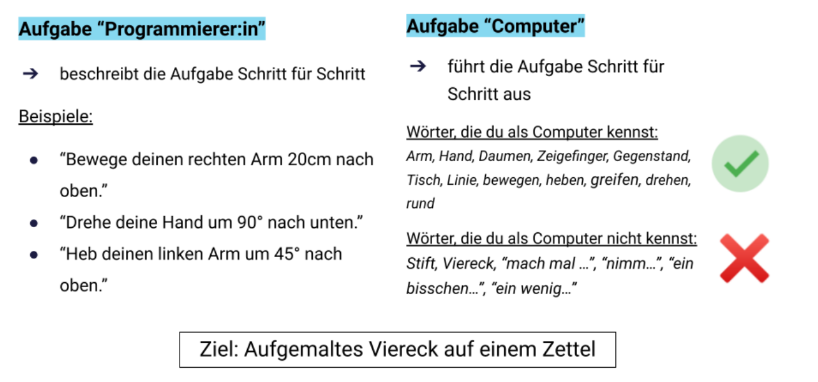 Die Schüler*innen haben sich in 2er-Gruppen jeweils so programmiert, dass am Ende eine Person (“der Computer”) ein Viereck auf ein Blatt Papier gemalt hat. Der:die Programmier*in ist für die Programmierung des Computers zuständig. Dies beinhaltet auch das Aufschreiben der einzelnen Schritte des “Codes”. Dies ist ein essentieller Bestandteil der Übung, da der Code zum einen am Ende benötigt wird, um ihn mit der gesamten Klasse einmal durchzuspielen/zu überprüfen und zum anderen um erklären zu können, dass eine unterschiedliche Anzahl an Schritten ans Ziel führen kann.